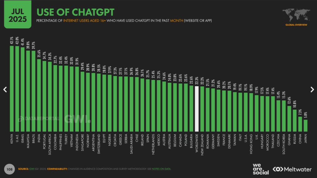 Snippet of July 2025 Report from Data Reportal indicating Kenya tops in ChatGPT usage for internet users aged above 16 years