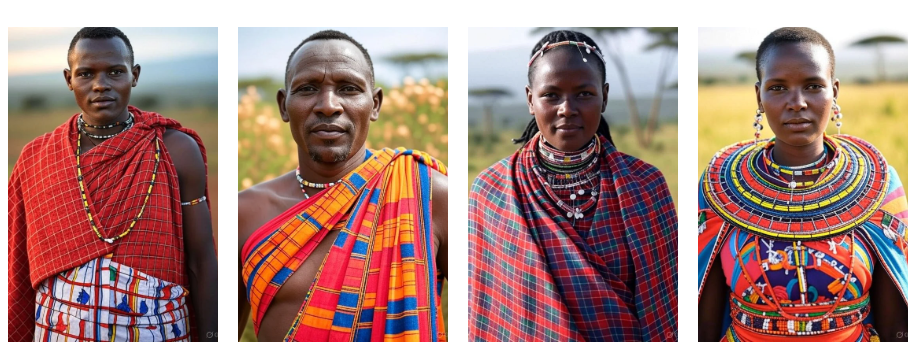The visual language of Maasai culture, red shukas, beadwork, spears, and jumping dances, is immediately recognizable and easy for AI models to anchor to, even with vague prompts like “African warrior” or “traditional tribe in Kenya.” This makes it more likely for models to default to Maasai representations when the input lacks specificity.